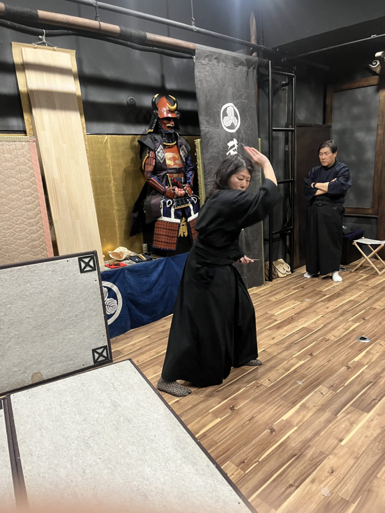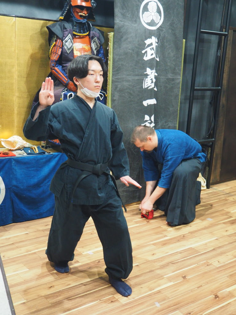 「打剣」と「掌剣」を学んだところで、その二つを繋ぐ併用法へと進んでいきました。敵に対し、正面から手裏剣を投げてもよけられてしまいます。そこで、相手との距離や位置などがテーマになります。