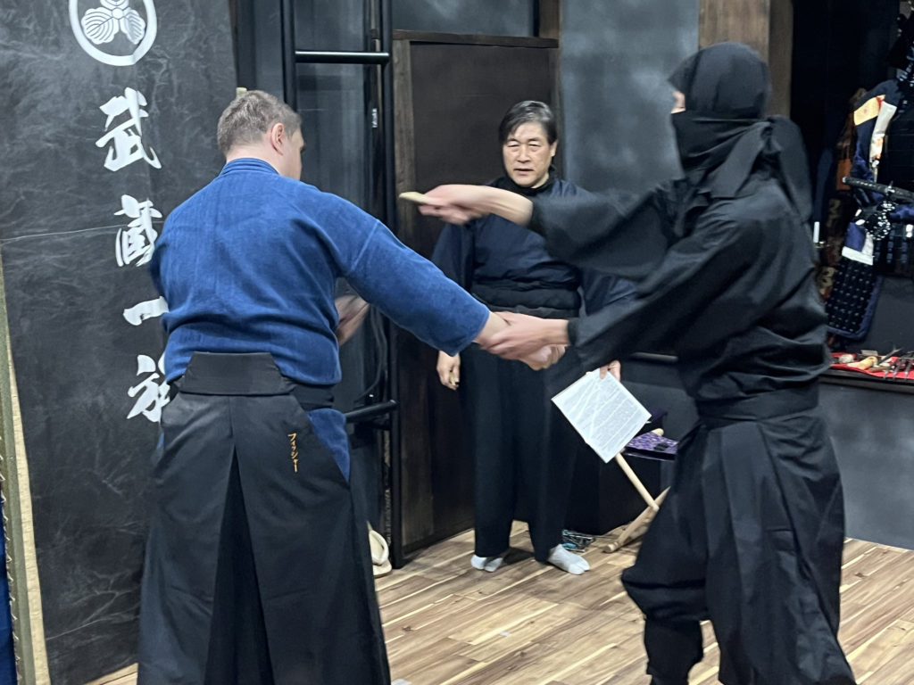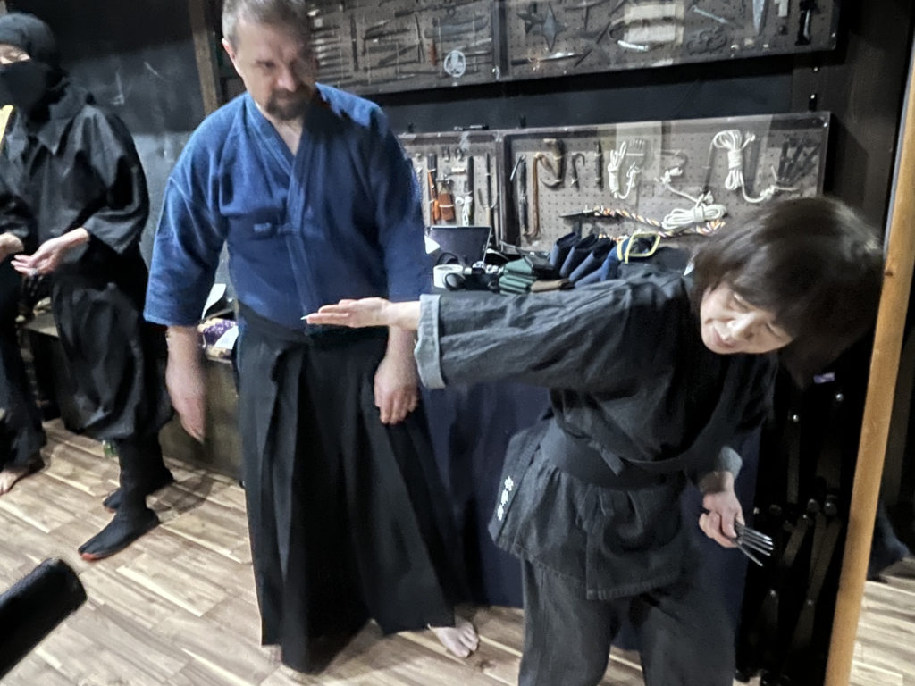 シンプルなフォームが技になるのは護身術として有用なシステムだと思います。手裏剣の代用品として、箸やボールペンなどを持っているだけで、非力でも大きな威力を出せます。また、日用品を武器として使うのは忍術に通じるものがあります。十字手裏剣もクナイも武器ではなく、忍び込む道具としての役割が大きいです。何かあれば道具を武器としても使える応用力、発想力が重要なのではないでしょうか。
